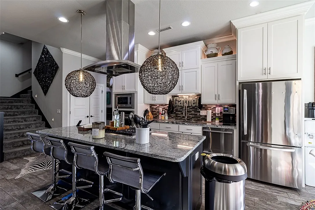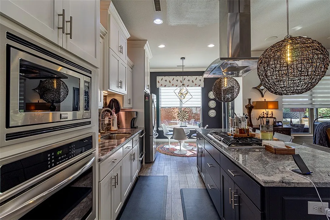 The kitchen features a cozy dining nook for four along with additional bar seating for four, creating the perfect setup for casual meals, morning coffee, or entertaining guests.